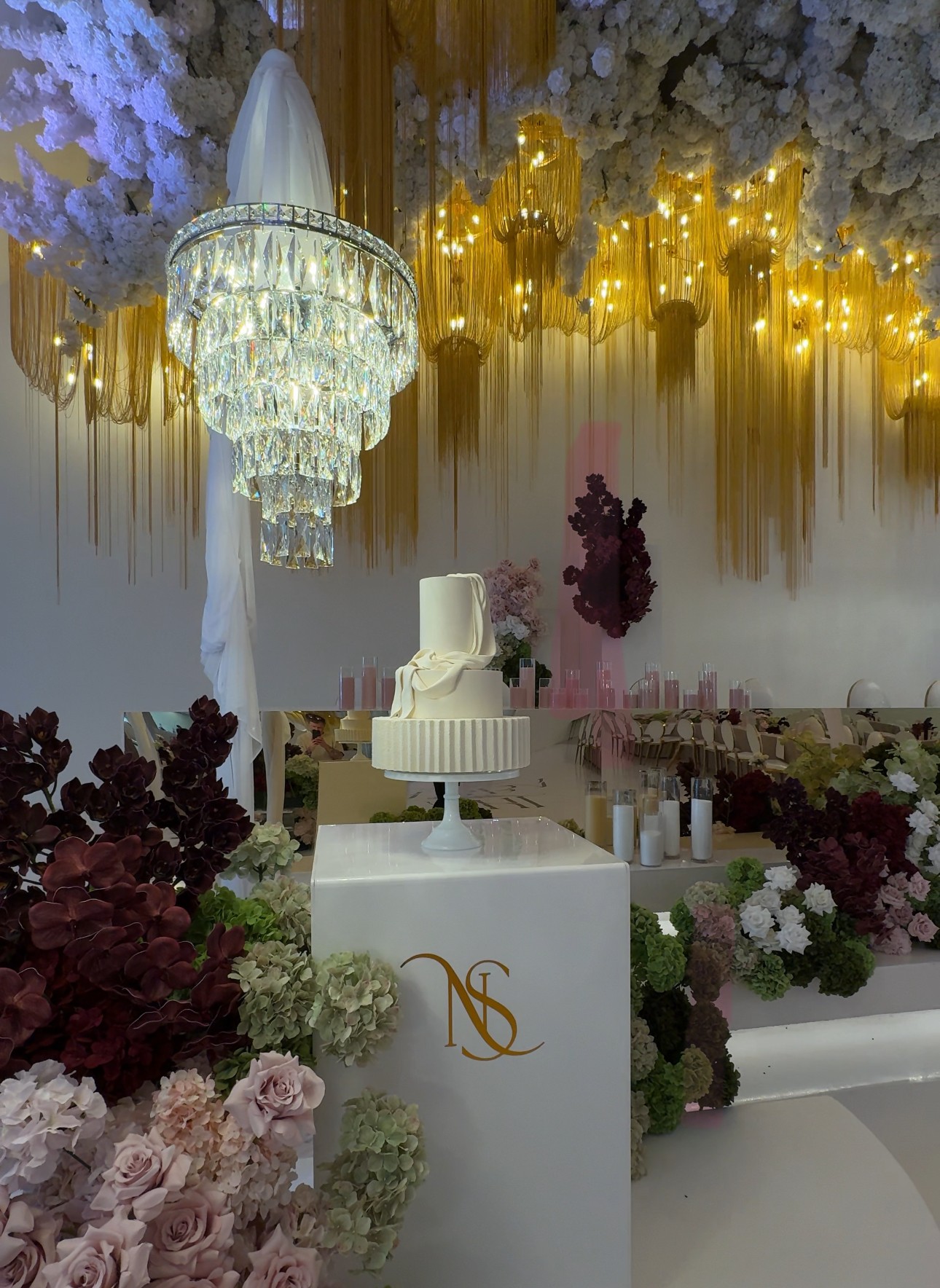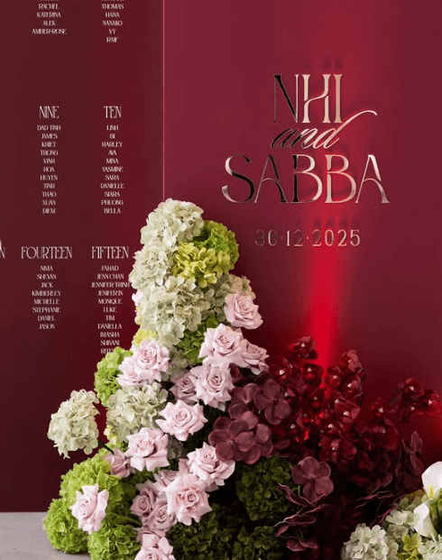 Held at Fior, this celebration for Nhi and Sabba leaned into a much deeper palette, with burgundy florals and gold detailing used throughout the space. Overhead chandeliers and fringe installations added a lot of movement, while mirrored elements kept the room feeling open rather than heavy.