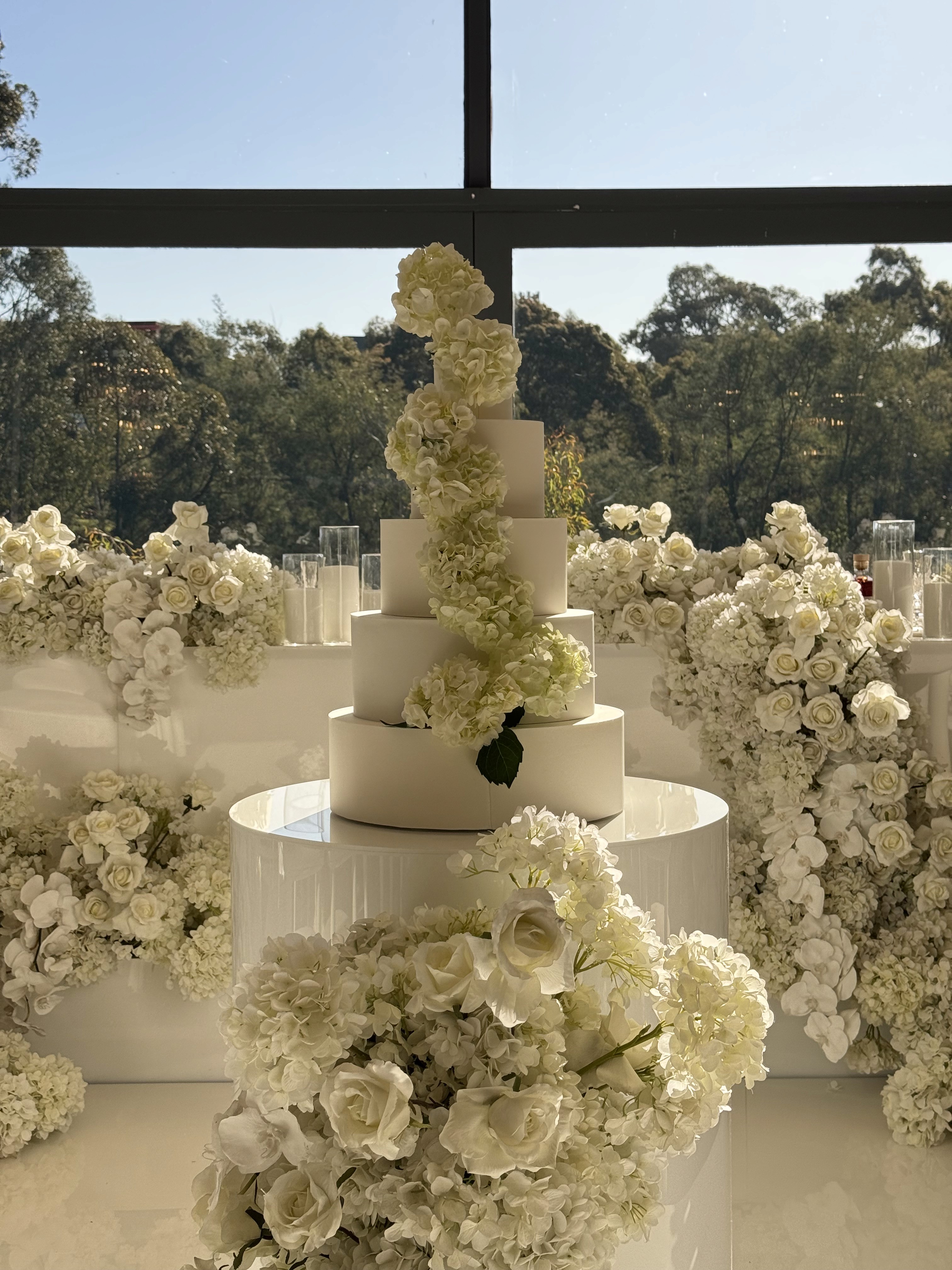 The cake was designed to follow on from the floral installation at the base, with a trailing arrangement of hydrangeas moving up through each tier rather than sitting separately. Kept minimal in finish, the intent was for the florals to carry the detail, tying it back to the wider styling.